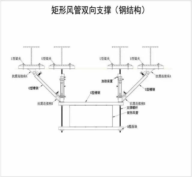 3.2抗震支吊架的形式和承重支吊架一樣也有很多種,主要有:單管抗震支吊架、門型多管抗震支吊架、電氣系統(tǒng)管道抗震支吊架、風管抗震支吊架、綜合管道抗震支吊架、及設備抗震支吊架等。