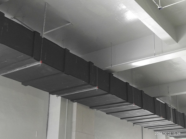 (1)玻璃纖維、塑料和其他非剛性材質(zhì)風(fēng)管的側(cè)向抗震吊架,最大間距為4.5m.縱向最大間距為9m。