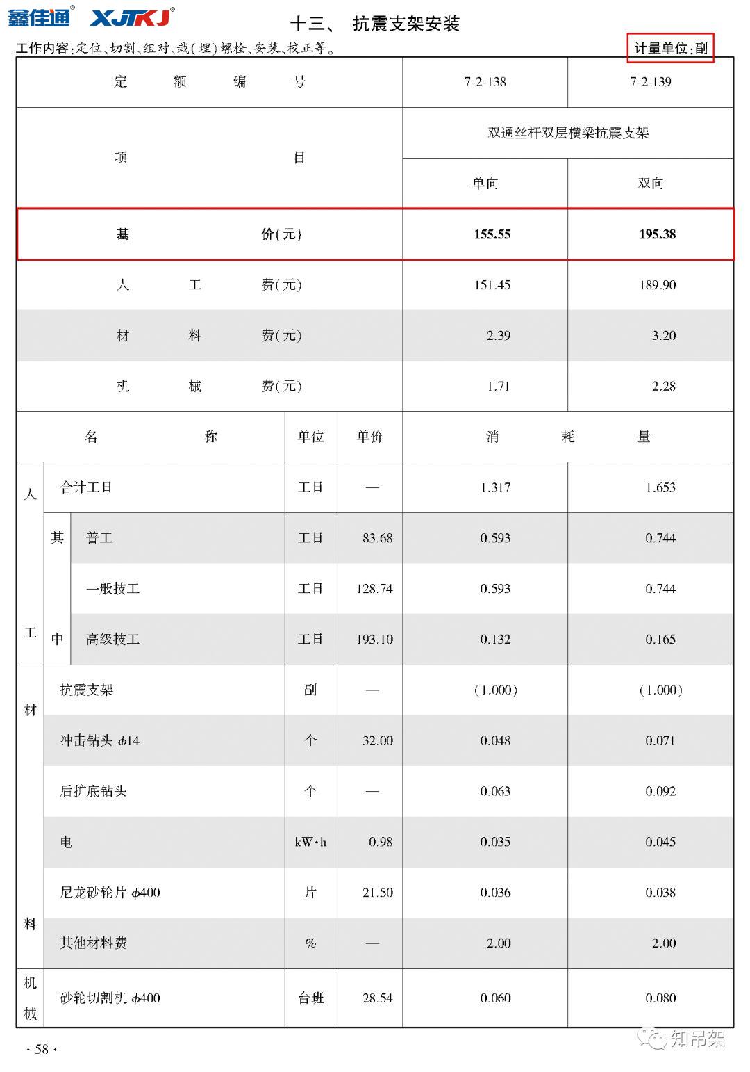 第七冊(cè)通風(fēng)空調(diào)安裝工程中,抗震支架安裝工作內(nèi)容包括:定位、切割、組對(duì)、載(埋)螺栓、安裝、校正等。對(duì)于雙通絲桿雙層橫梁風(fēng)管抗震支架,擬按照單向抗震支架基價(jià)155.55元/副,雙向抗震支架基價(jià)195.38元/副。