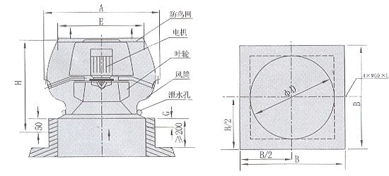 b、離心式屋頂風機:代號為DWT-II,型、DWT-III型二種型式,適用于風量較小而壓力要求較高的場合。