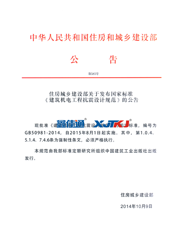 根據(jù)《中華人民共和國建筑法》和《中華人民共和國防震減災法》,實行以"預防為主"的方針,經(jīng)抗震加固后的建筑給水排水、消防、供暖、通風、空調(diào)、燃氣、熱力、電力、通訊等機電工程設施,當遭遇到本地區(qū)抗震設防烈度的地震發(fā)生時,可以達到減輕地震破壞,減少和盡可能防止次生災害的發(fā)生,從而達到減少人員傷亡及財產(chǎn)損失的目的。機電抗震支架系統(tǒng)是限制附屬機電工程設施產(chǎn)生位移,控制設施振動,并將荷載傳遞至承載結(jié)構上的各類組件或裝置。2015年住房城鄉(xiāng)建設部發(fā)布國家標準《建筑機電工程抗震設計規(guī)范》公告:批準《建筑機電工程抗震設計規(guī)范》為國家標準,編號為:GB 50981-2014,自2015年8月1日期實施。