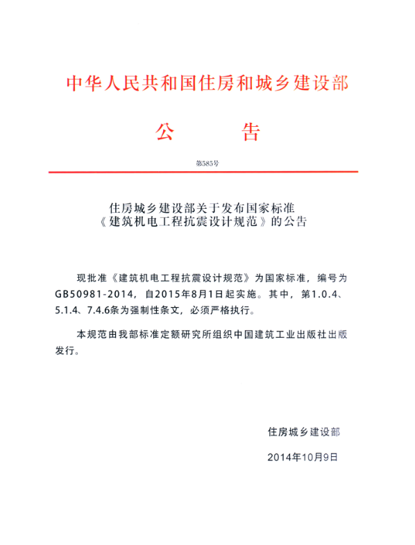 依據(jù)2015年住房城鄉(xiāng)建設部發(fā)布實施的國家標準GB50981-2014《建筑機電工程抗震設計規(guī)范》,其中明確規(guī)定了抗震支吊架的設計與使用。該標準自2015年8月1日起實施,也意味著自此之后的建筑機電工程必須要考慮抗震支吊架了。