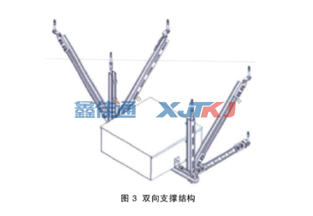 綜合了側(cè)向支撐和縱向支撐兩種支撐形式特點(diǎn)的支撐結(jié)構(gòu)即為雙向支撐結(jié)構(gòu),又稱四向支架(圖 3),一般適用于機(jī)電管線較多、支架承重較大的情況