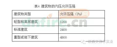 防護(hù)區(qū)內(nèi)門、窗上的玻璃允許壓強(qiáng)不應(yīng)低于建筑物的允許壓強(qiáng)。目前國(guó)內(nèi)各設(shè)計(jì)部門防護(hù)區(qū)內(nèi)圍護(hù)結(jié)構(gòu)承受內(nèi)壓的允許壓強(qiáng),無論建筑物是輕型和高層建筑,還是標(biāo)準(zhǔn)建筑及地下建筑,均設(shè)定為1.2KPa,該值的設(shè)定是依據(jù)GB50370-2005標(biāo)準(zhǔn)中3.2.6條款,參照美國(guó)NFDA12B-1980標(biāo)準(zhǔn)中給出的,若設(shè)計(jì)部門和用戶需提高防護(hù)區(qū)內(nèi)圍護(hù)結(jié)構(gòu)承受的允許壓強(qiáng),應(yīng)由建筑設(shè)計(jì)部門試驗(yàn)給出。
