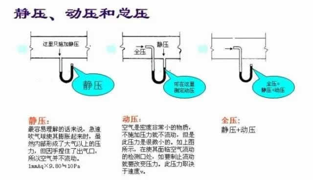 在選擇空調(diào)或離心風(fēng)機(jī)時(shí),常常會遇到靜壓、動壓、全壓與余壓。根據(jù)流體力學(xué)知識。流體作用在單位面積上的垂直力稱為壓力,當(dāng)空氣沿風(fēng)管內(nèi)壁流動時(shí),其壓力可分為靜壓、動壓和全壓。單位分別為mmHg或kg/㎡或Pa。