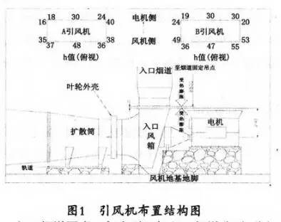 1.2.1 進、出口煙道因素。引風(fēng)機布置在電除塵出口,每兩個室混入一個風(fēng)道,然后直通進入引風(fēng)機入口風(fēng)箱。任何一段與另一段膨脹產(chǎn)生差異,都通過伸縮節(jié)來進行補償,補償不夠或膨脹受限,都會導(dǎo)致風(fēng)道與設(shè)備硬接觸。引風(fēng)機布置結(jié)構(gòu)如圖1所示: