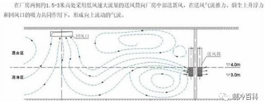 在某些高大空間內(nèi),若實(shí)際工作區(qū)在下部,則不需將整個(gè)空間都作為控制調(diào)節(jié)的對(duì)象,可采用中送風(fēng)方式,可節(jié)省能耗。但這種氣流分布會(huì)造成空間豎向溫度分布不均勻,存在溫度“分層”現(xiàn)象。