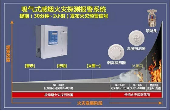 火災(zāi)的發(fā)展分為四個(gè)階段:萌芽(不可見煙霧)、可見煙霧,火焰和高熱階段。上圖表示了在一定時(shí)間內(nèi)火災(zāi)的不同發(fā)展階段。注意在火災(zāi)在萌芽期的醞釀階段提供了更多的時(shí)間與機(jī)會(huì)來探測并控制火災(zāi)的發(fā)展。