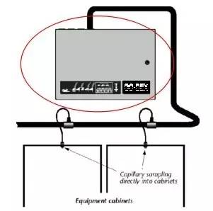 典型的吸氣式感煙火災(zāi)探測器的安裝方式,所有盤內(nèi)的空氣樣品透過軟管匯流到采樣管送到探測主機(jī)進(jìn)行煙霧檢測,利用管路及軟管抽取機(jī)柜內(nèi)部的空氣進(jìn)行分析。