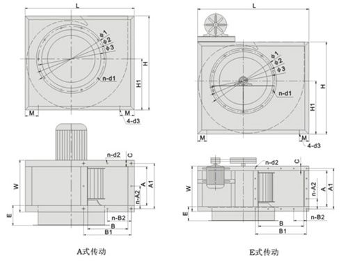 本系列風機分A式直聯(lián)傳動和E式皮帶傳動,按葉輪旋轉(zhuǎn)方向分為左旋和右旋,旋轉(zhuǎn)方向從電機或皮帶輪側(cè)看為準,以出風口分為00、900、1800、2700四種出風方式,訂貨時需注明。