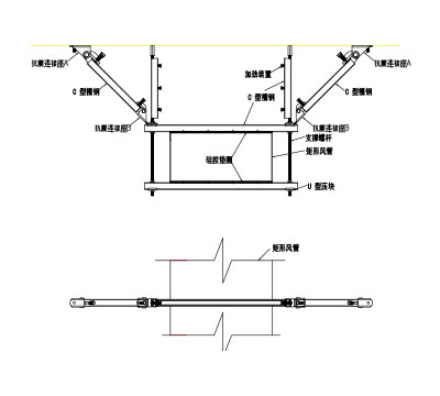 矩形風(fēng)管側(cè)縱向裝配抗震支架與建筑結(jié)構(gòu)體牢固連接,以地震力為主要荷載的抗震支撐設(shè)施。由錨固體、加固吊桿、抗震連接構(gòu)件及抗震斜撐組成。
