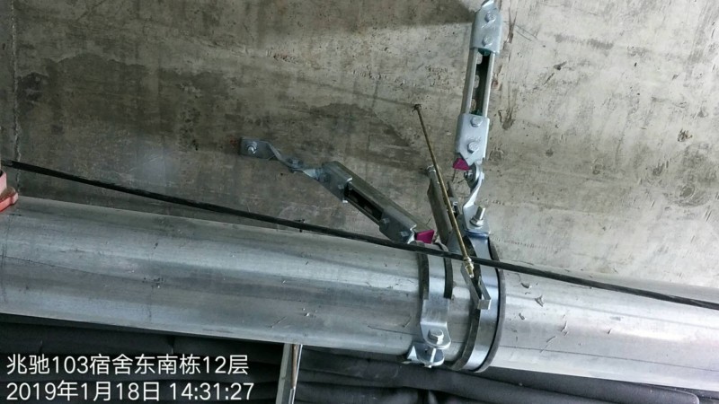給排水消防側(cè)向抗震支架安裝側(cè)向支撐又安裝縱向支撐,其作用原理是在管道質(zhì)心水平面上形成互成90°的4個方向上的支撐,水平地震力從任意方向作用,管道均受到保護。成90°安裝的兩個剛性支撐,因其同時具有抗拉壓能力,所以能對管道作水平方向的保護;對柔性支撐,則須做水平面上互成90°的4個支撐。